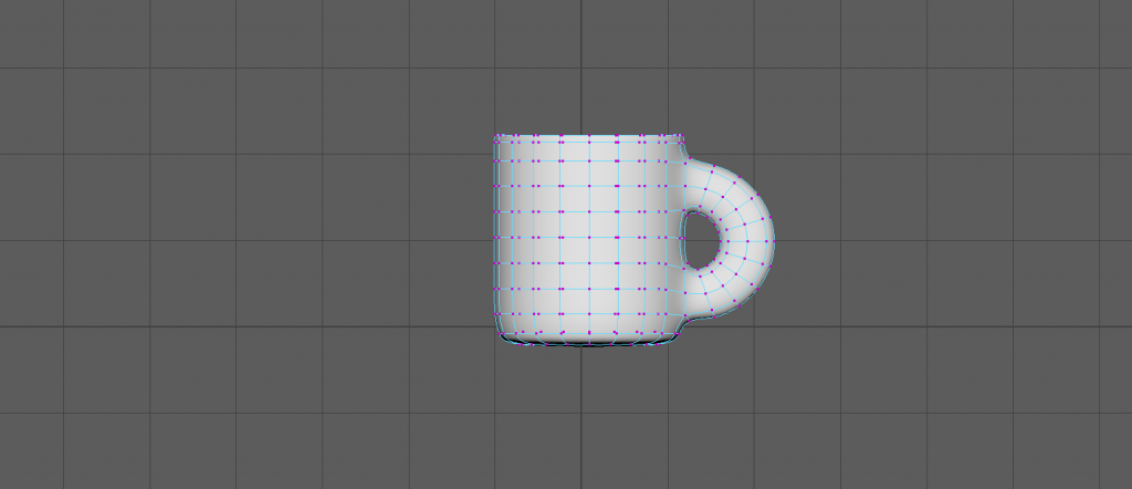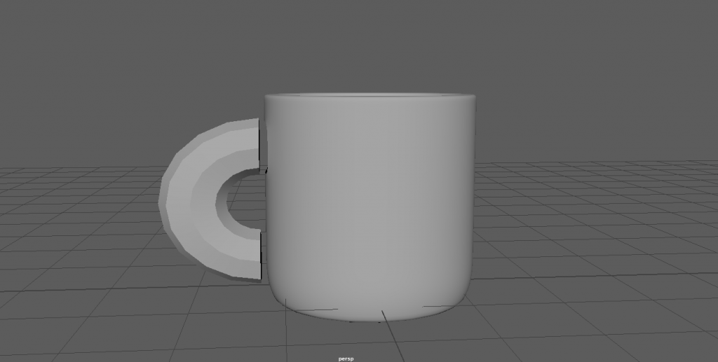once i was happy with the shape of the mug i then cut a torus in half giving me a basic handle i then used the scale tool to create the shape of it that i wanted. once i was happy with it i then lined it up with the side of the mug, and then deleted the faces that lined up. i did this at the bottom of the mug too.i switched to the side view then switched to the vertex option, i then selected all of the vertex apart from the 2 bottom rows. i then shaped the cup to how i wanted it. (didn’t have a screen shot of it without the handle). to get the shape of the mug that i wanted i reduced the amount of subdivisions so i could remove the top of the cylinder at once, i then made the mesh smooth to remove the sharp edge. i made sure to extrude the cylinder too so it wasn’t too thin.