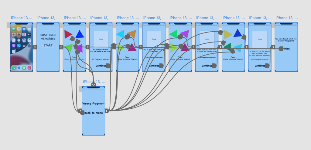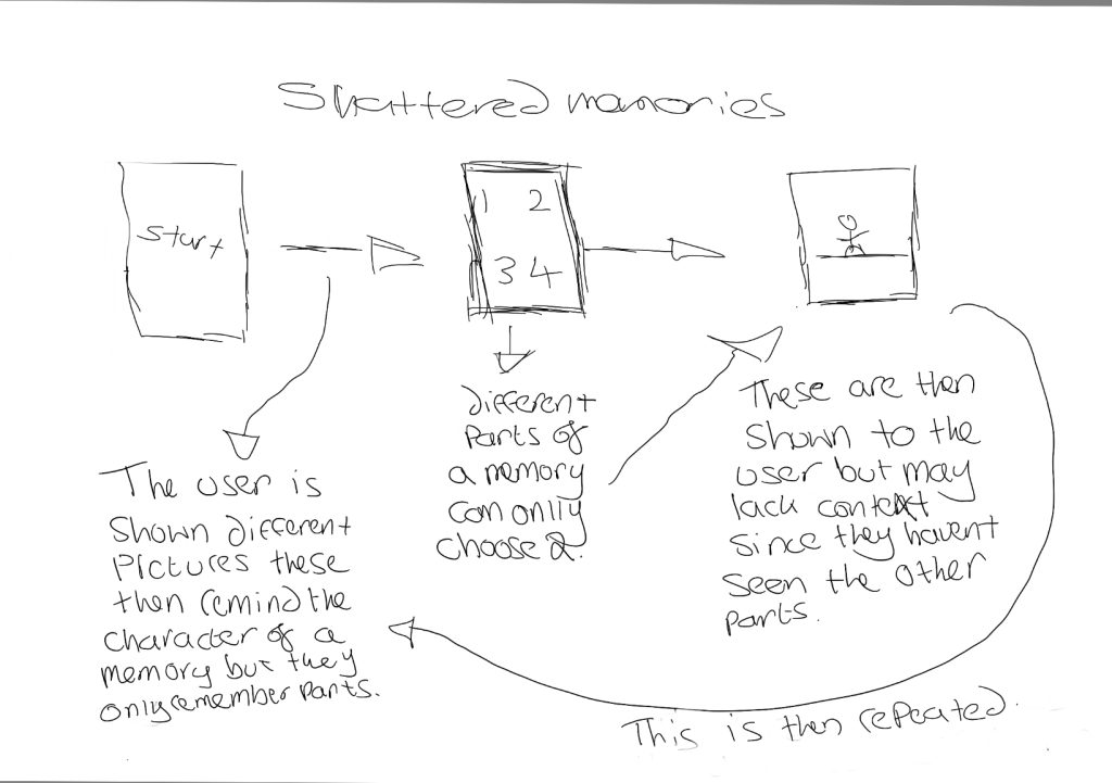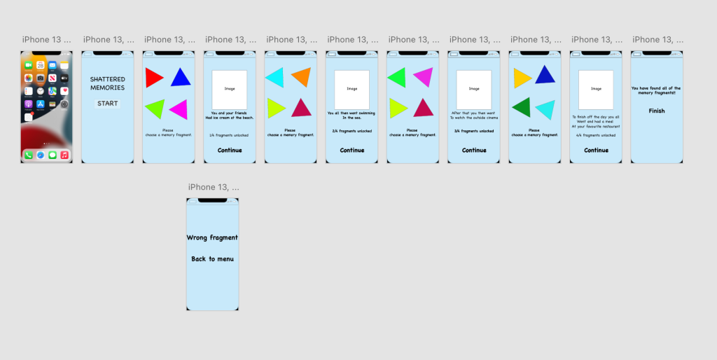My prototype game idea (app) is called shattered memories, it’s about a character that suffers from an illness and struggles to remember things. They start to recall certain memories when they see a certain object, picture, etc. The user will have to choose 1 out of 4 fragments they see on their screen if this is the correct one they then progress onto the next stage where they will have to do this again till they have got 4/4. As they progress it reveals more and more about the memory until the whole memory has been revealed.