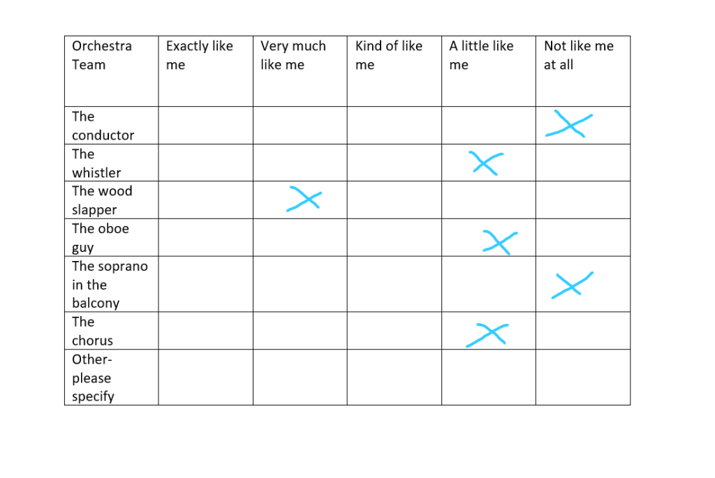 These roles were also effected by the psychometric test we had done in the first week to see how much we related to certain parts of a orchestra starting at the conductor going all the way to someone who’s out of the way in the background/doesn’t have a huge role but still has a vital part to play, which I would say I relate to a lot more than the conductor. We also used this information to decide the groups by going around talking to different people in the class to see what their skills were and what they would say their role would be.