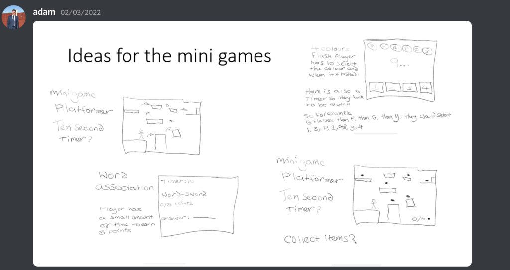 During some discussions we talked about the main part of the project we wanted to get done, so for me it was about getting the code done to a good amount and for Adam it was the modelling of the area which he did very well. I planned on doing my work on unreal engine Adams work was done through modelling software. We also compared the different mini game ideas however we didn’t go with these due to the change of the project after the feedback we had during the lectures when we presented to the group. Adam followed this up by making a diagram with the different aspects of the game.
