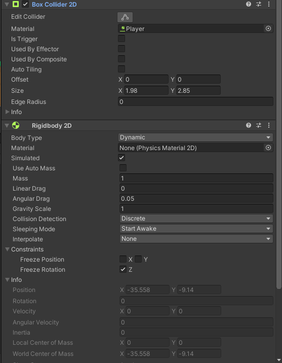 Once this was done i went back into unity and made sure i added a 2D box collider and a rigidbody 2D component to my player sprite. i also added a 2D physics material to stop the player getting stuck like we had done for the project earlier in the module. I added the 2D box collider to the test blocks in the scene too to make sure the player didn’t fall through them and could walk on them and jump.