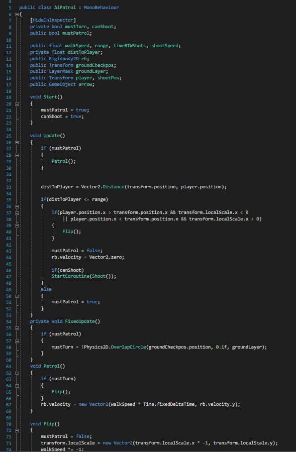 As shown in the script the ground check (which is placed at the feet) will make sure there is a object with the layer ground, without this the enemy will repeatedly turn left then right. The script also checks the distance between the player and the enemy and once the player gets in range of the enemy it will stop patrolling and focus on the player trying to kill them.