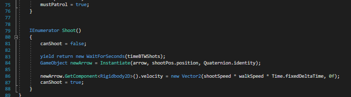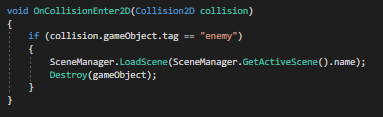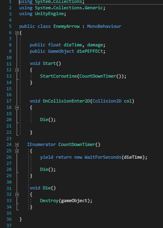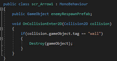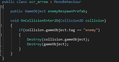I then added a smaller script to the arrow so when it hits any object tagged as ‘enemy’ it would kill them and also disappear.