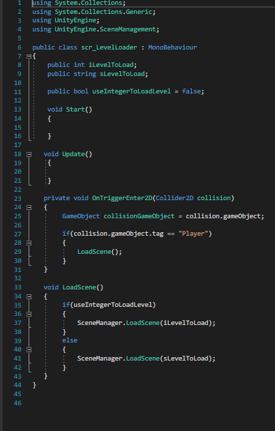 Once all this was done i then wanted to add in something the player could collide with or trigger to cause the game to load the next level. After doing some research etc i ended up with this.