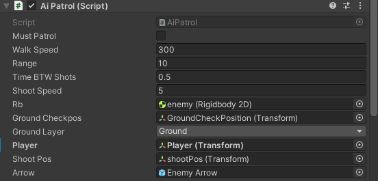 Here are the components of the script, The player transform is what makes them focus on the player once they are in the range of 10 as shown above. ShootPos makes sure the arrow comes from the front of the bow and the arrow prefab is the arrow setup to kill the player.