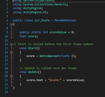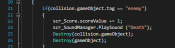 As shown above within the if statement is scr_SoundManager.PlaySound and then the sound i want to play when the enemy is killed by the players arrow. However for this to work you need the script in the screenshot below at the start of your script. you can also see within this script is a line for score. Every time a player kills an enemy this increases by one.