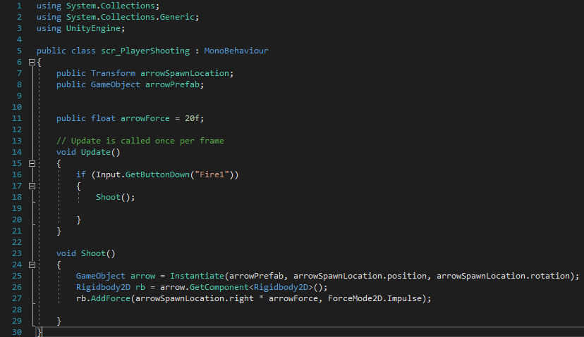 i created a simple arrow for my bow once i did this i put it into unity and added the components 2D box collider and rigidbody 2D. I then created a prefab of the arrow so i could delete the original off screen. Once this was done i moved onto the script for shooting the arrow.