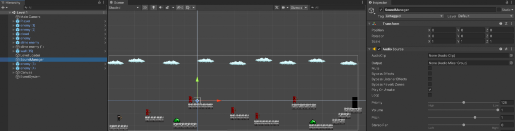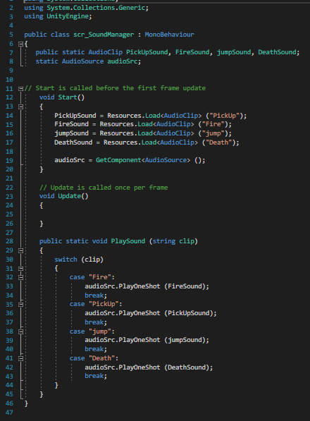 I double checked the sounds to make sure they were correct and that i was happy with them. To get them to work in each scene is a Sound Manager which is in the centre of each scene. It also has a audio source attached to it. Below the image is the script for the sound manager too.