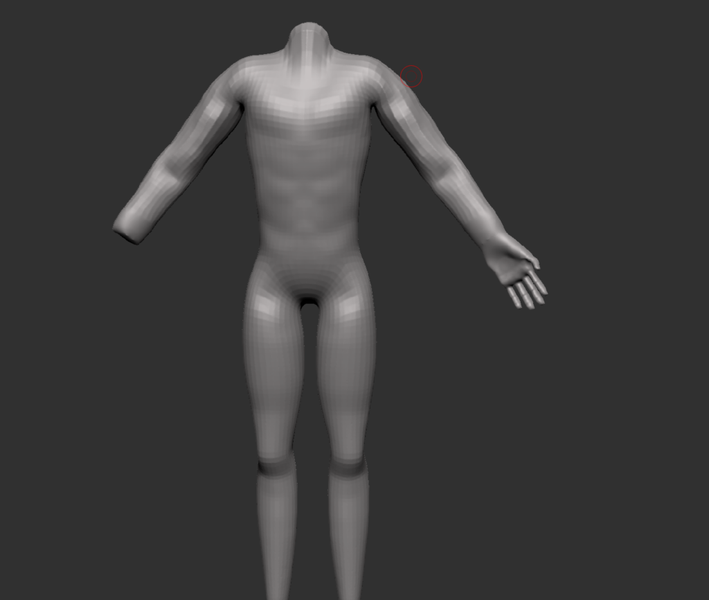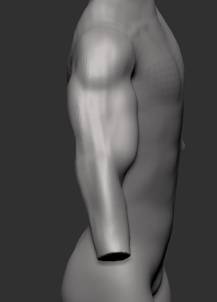 I then repeated this with the torso, making the abs less symmetrical, gave the pecs more of a curve at the bottom as they were quite square before and did not look right. I also made changes to the shoulder so it goes into the arm instead of being above it like it was in earlier screenshots (figure 3).
