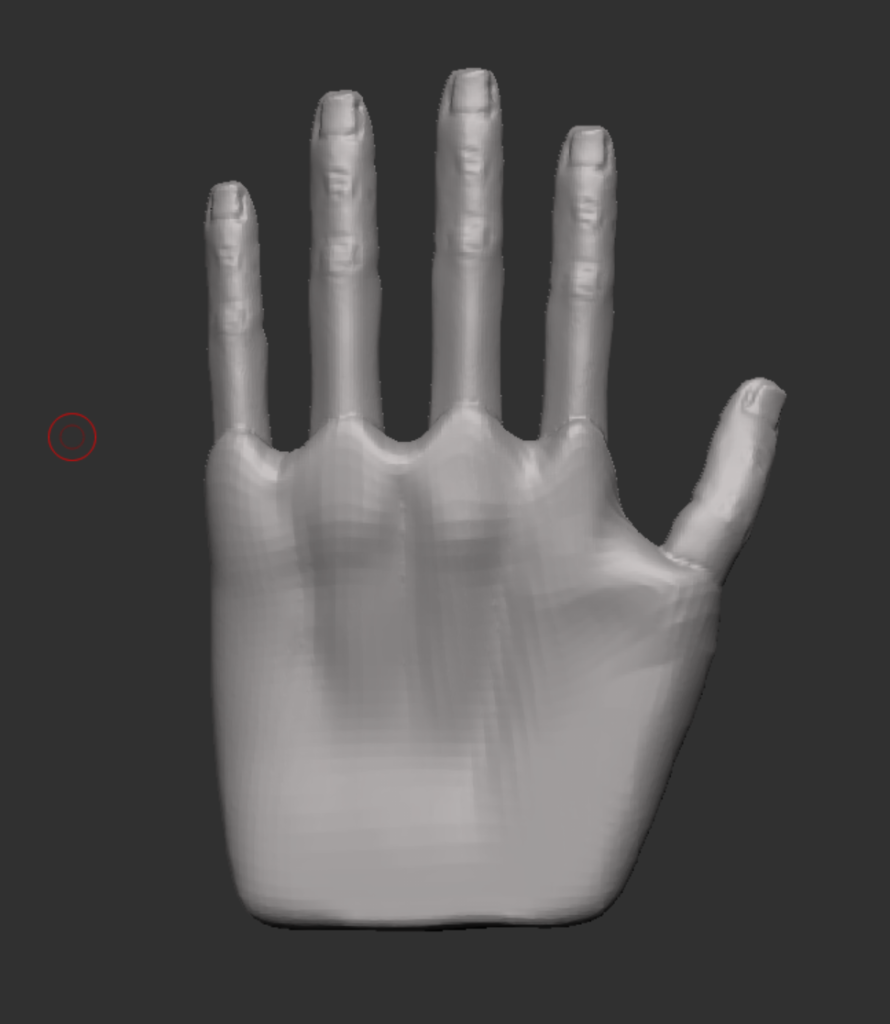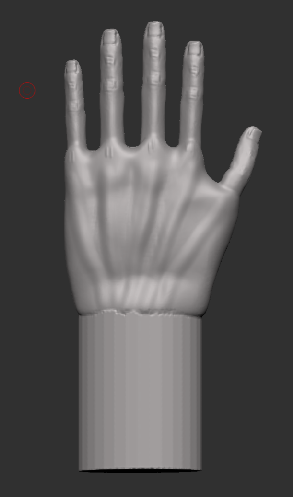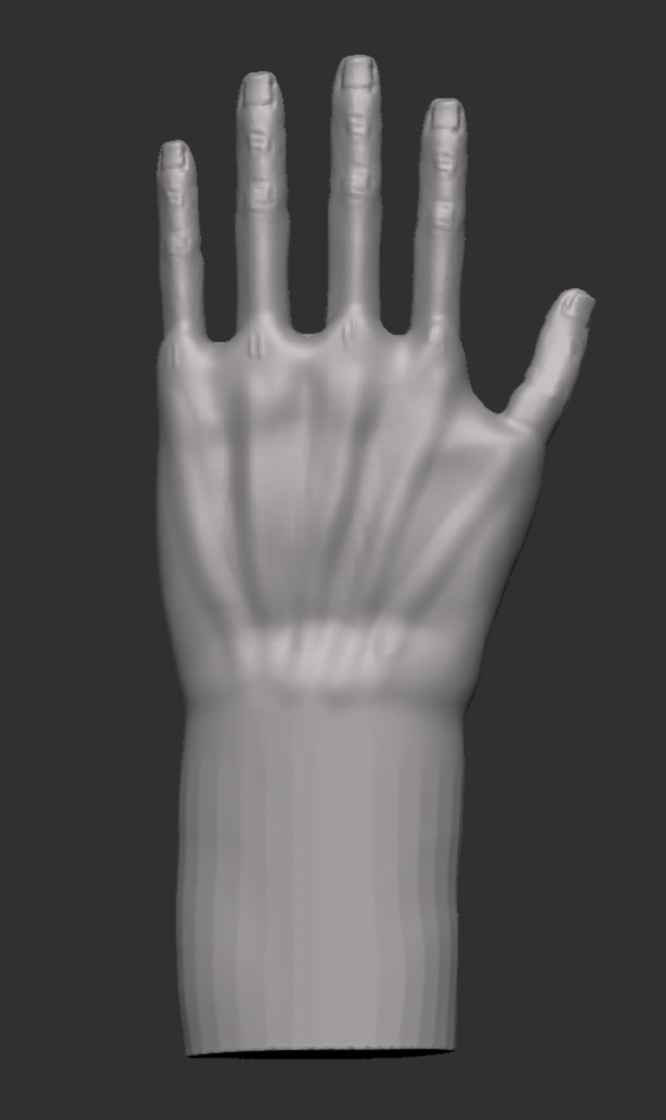 I then started working on the hands, i have made a couple hands as i wanted to see if i could make it better and see which i liked the best. The first hand (figure 1) was made using the book Anatomy for 3D artists, which has different tips and example work. I used a cube rescaled it and smoothed the corners. I then made the finger using a rescaled cube and a couple brushes, these being trim dynamic, dam standard and the smooth brush. I then duplicated and rescaled the other fingers and thumb before merging them with the hand. Finally i added a few details using the standard brush and a cylinder for the wrist.