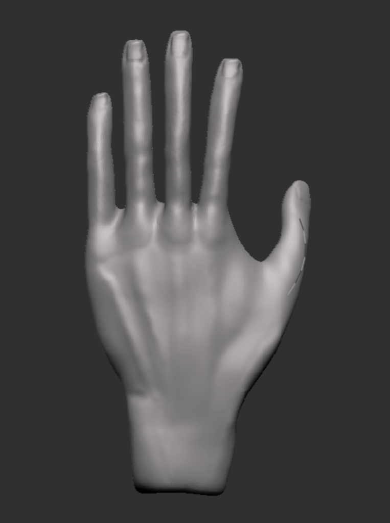 I then started the second hand (Figure 2) similar to the first hand i started with a cube and rescaled it so it was thinner before using the trim dynamic brush to round out the corners, and give the curve at the top of the hand where the knuckles would be. I then pulled out a part for where the thumb will be and same for the wrist. I then added the knuckles and some other details like the bone that can be felt on the left side of the wrist. Instead of making a new finger i used the one i made for the first hand. I connected it the same way using merge and dynamesh. The thumb was then added last using the curve tube brush and the trim dynamic brush to help make the shape.