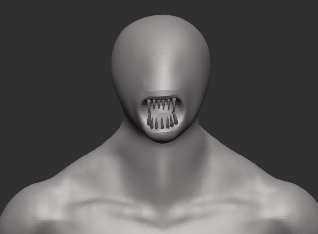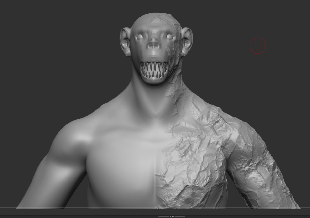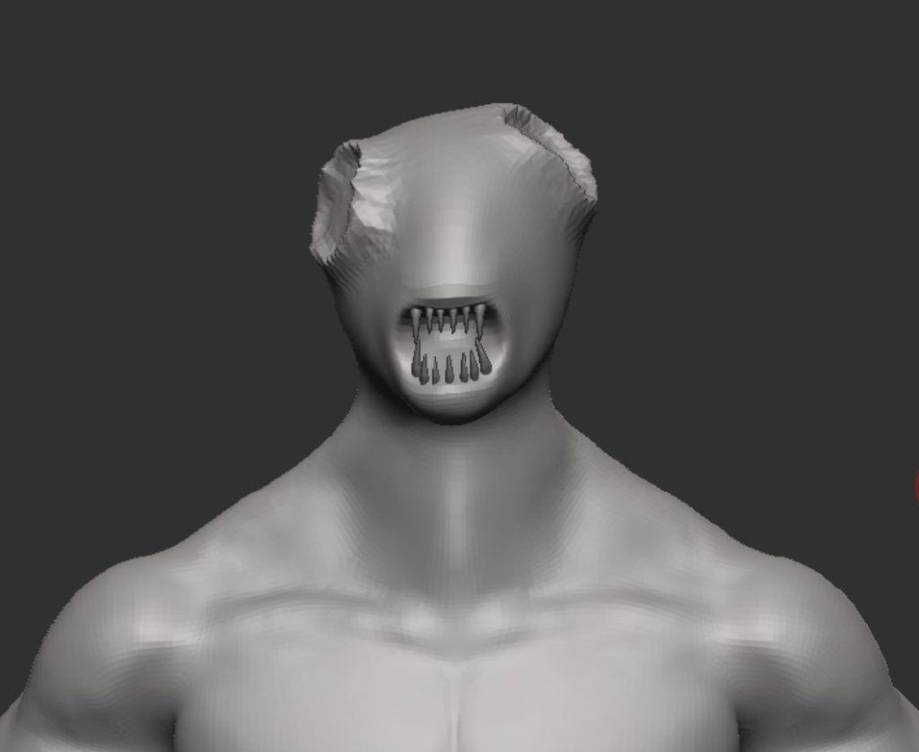 The head was something I was undecided with for a while but I have decided to stick with the werewolf/Lycan look. Its currently just a very basic head with a “snout” that was created by pulling out the mesh from above and below the indent I made for the mouth. I then added the teeth this was done by pulling out the bottom of a sphere scaling the sides in and shaping the top to be sharp. To stay on the mutation side I tested an alpha I download from Artstation that creates things like craters (as shown in the first image) however I wont be keeping them on the head but may use them on other parts of the body if it fits visually.