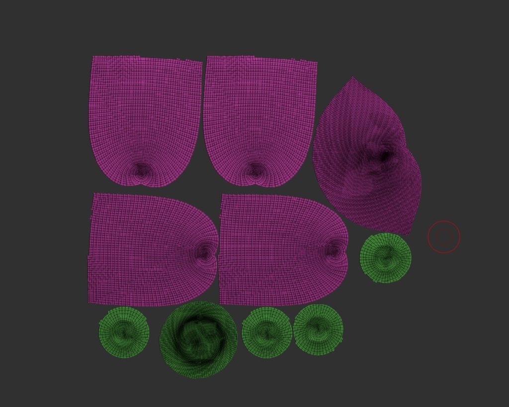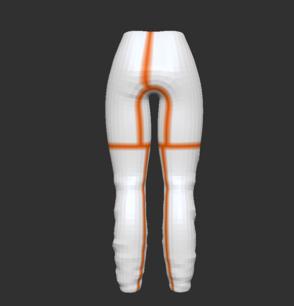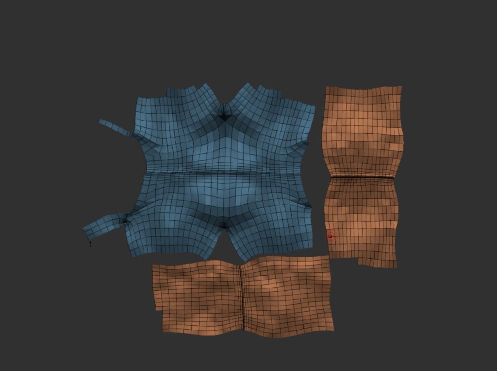 I then used UV master to create the UVs making sure to use the polygon setting and the symmetry setting if needed. To assist Zbrush with creating the seams I made sure to use the attract and project paint tool to try and make sure seams were out of the way as best as possible. Here is an example of the UVs and the seams being at the back of the trousers, and as you will see in a example later on the seams are not visible unless the texture pattern changes.