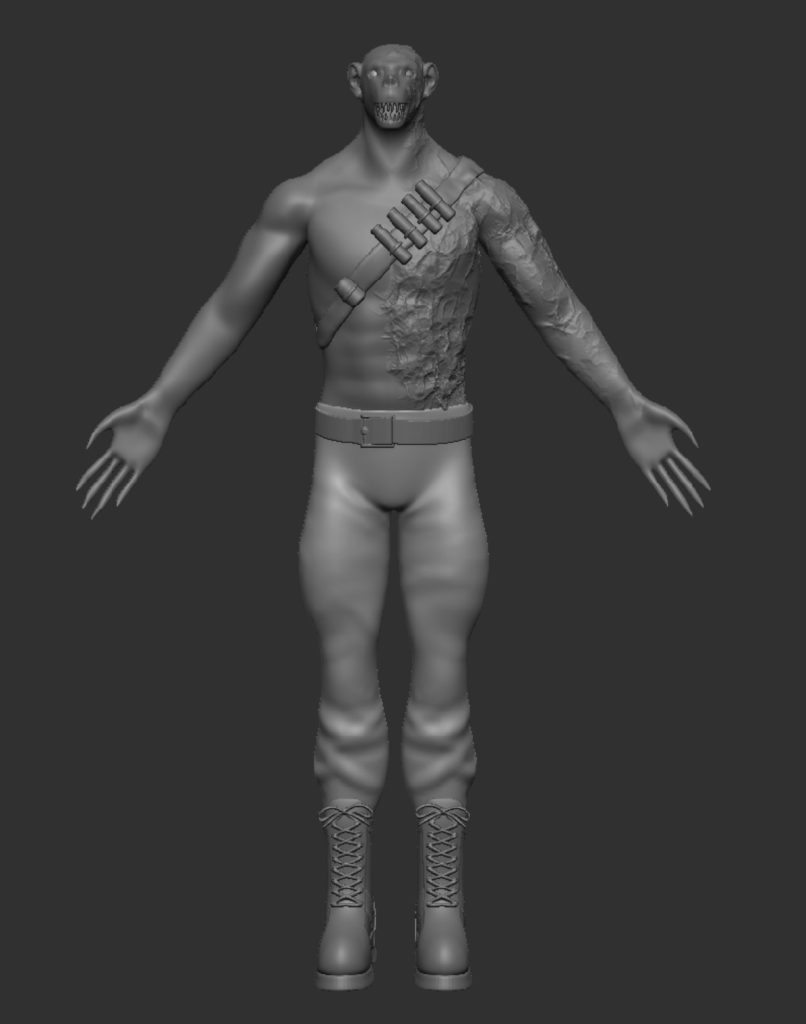 I then followed this up by using the different reference images i had collected to help with adding detail and shaping the face. I originally was going down the werewolf route for the face shape however, when the ears were done the character gained a more ape like face which i decided to stick with. The eyes were then added in just to help visualise how it will look finished. I made sure to add creases where needed for the trousers as they are not skin tight.