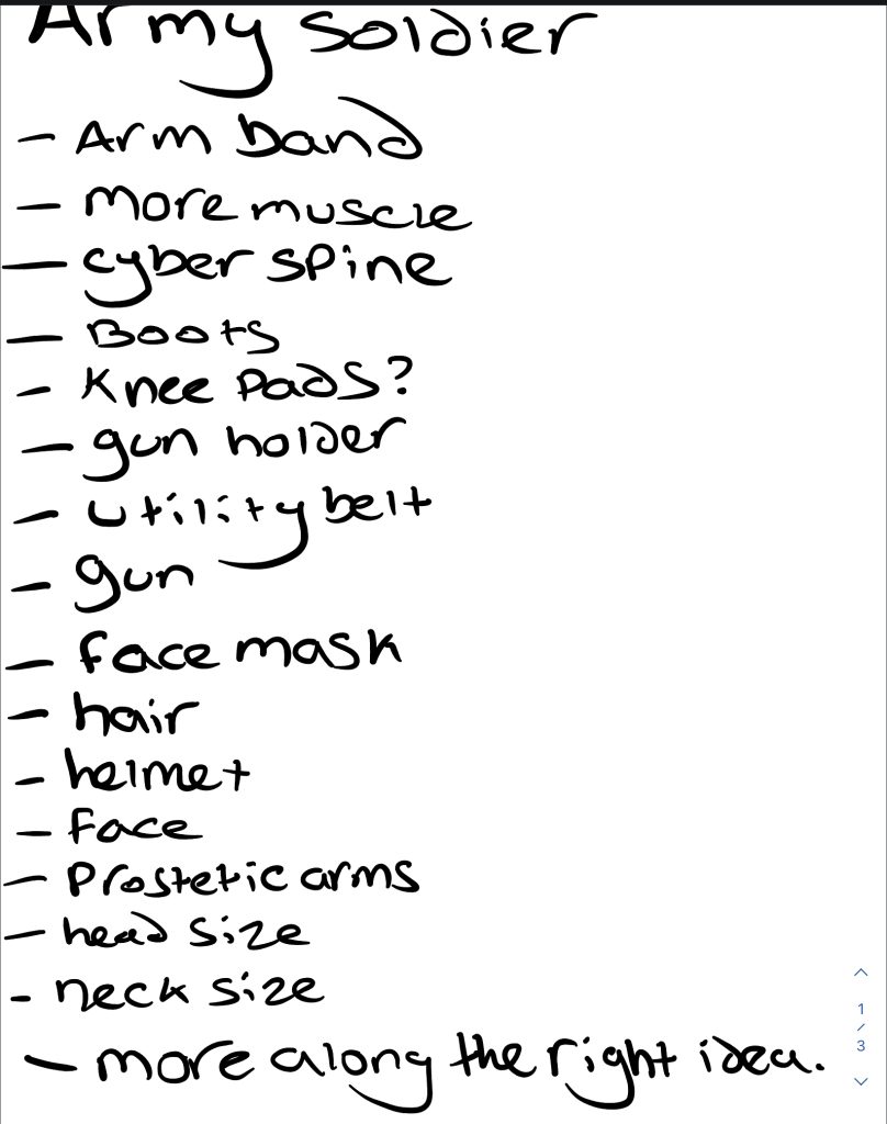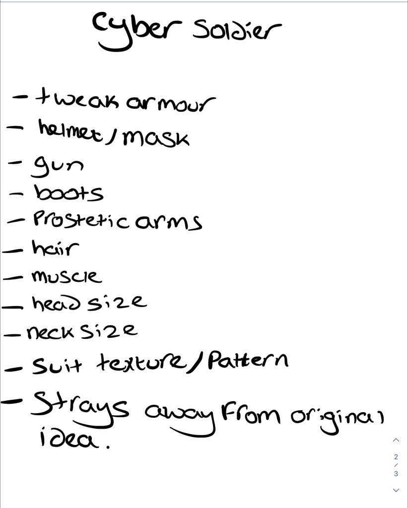 It was then at this point where I started questioning if I was happy with how this character was developing and started to wonder if I had swayed too far from the idea of this being a semi futuristic army soldier like I first planned. So I made a list of what I would need to do for the rest of this character and if made changes to it to bring it back on the path of the army soldier, this helped me get a clear idea of what would need to be done & changed. I also did a quick block out just to get a idea for the clothes.