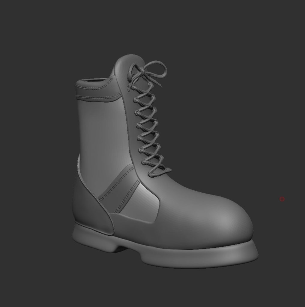 It was now time to add some of the extruding parts of the boot, again this was done by making the area needed and then using the deformation settings to smooth and inflate it to how thick it needed to be. I also used Zmodeler to add a border to the back piece of the boot. The first image design was not kept as I did not like how the masked piece look. I continued to add parts following the reference image before finishing off with the stiches and laces, these were from a IMM brushes from Artstation.
