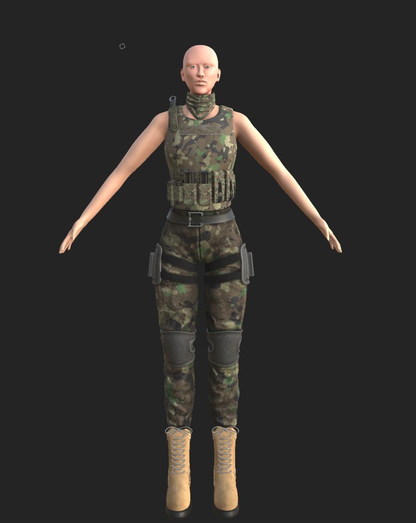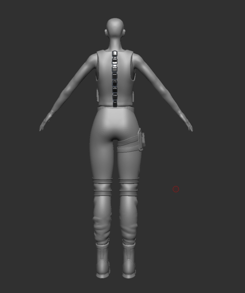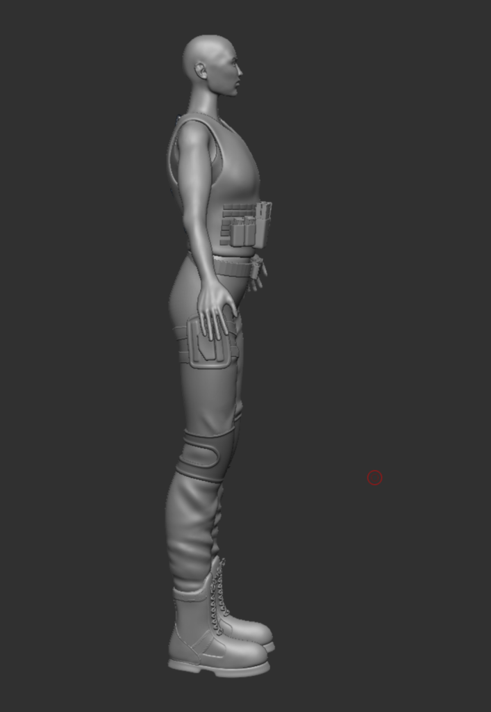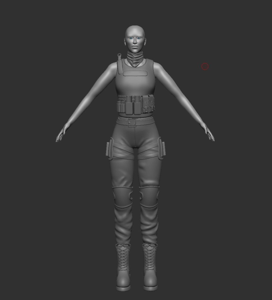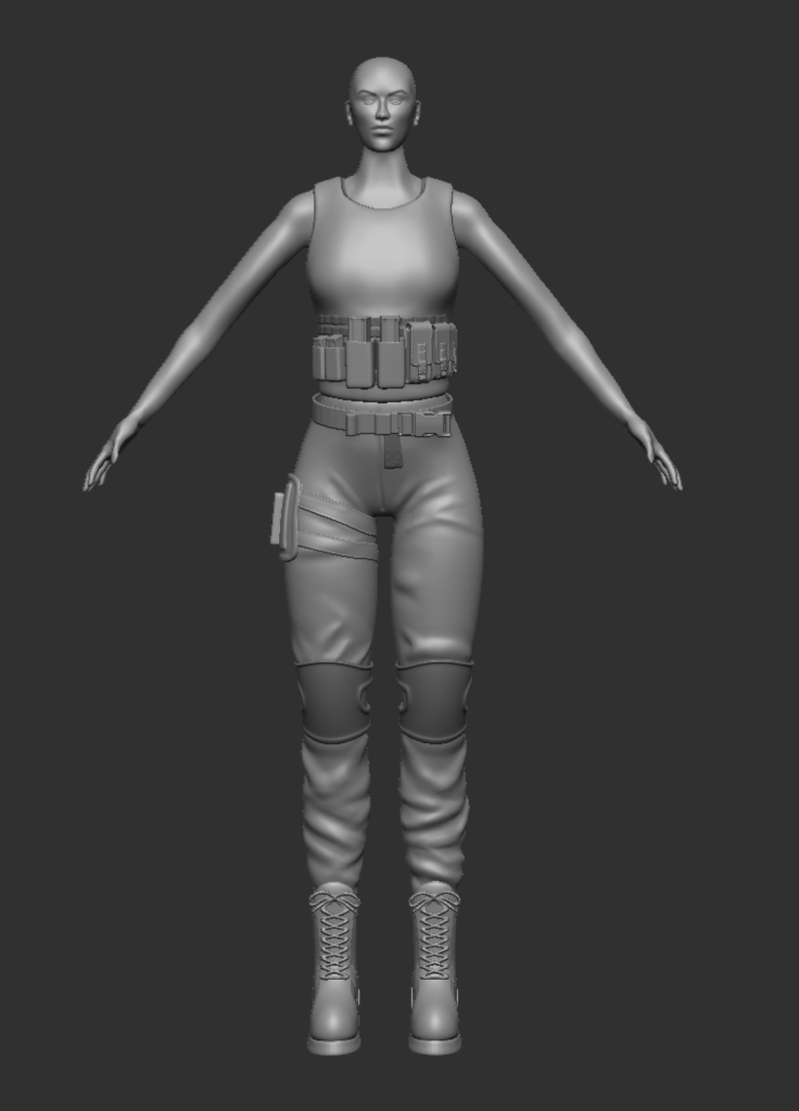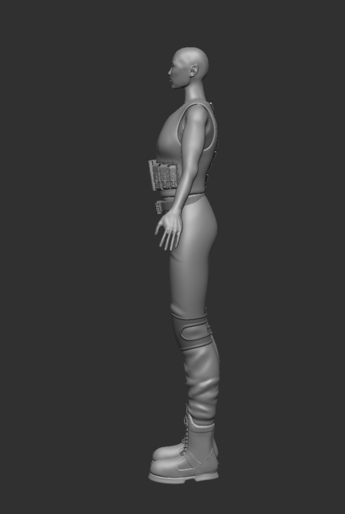 I started off with the vest making sure there was no clipping and the space for the arms was correct. I then added the molle loop attachments which is where the magazine holders and pouches would attach. I followed this up by making cloth creases along the legs of the trousers based on references I was using. The final couple things were the gun holders and the kneepads, these did not take long to make using simple shapes and the Zmoddler tool, however I had a slight issue initially with getting the right shape of the pistol holder however i figured it out in the end by watching a few videos on youtube. I then finished it off by making a simple belt that could potentially be used to carry things.