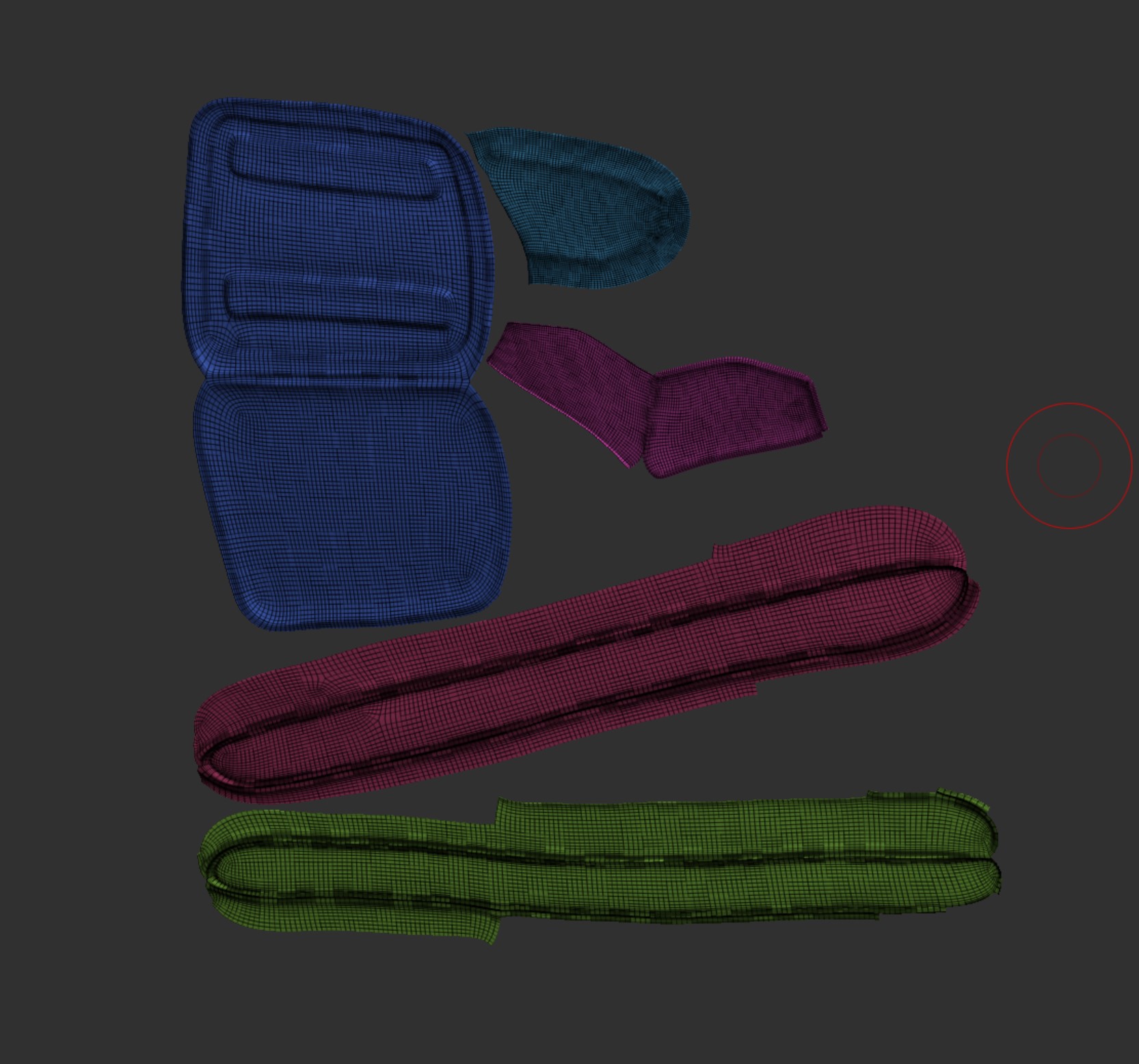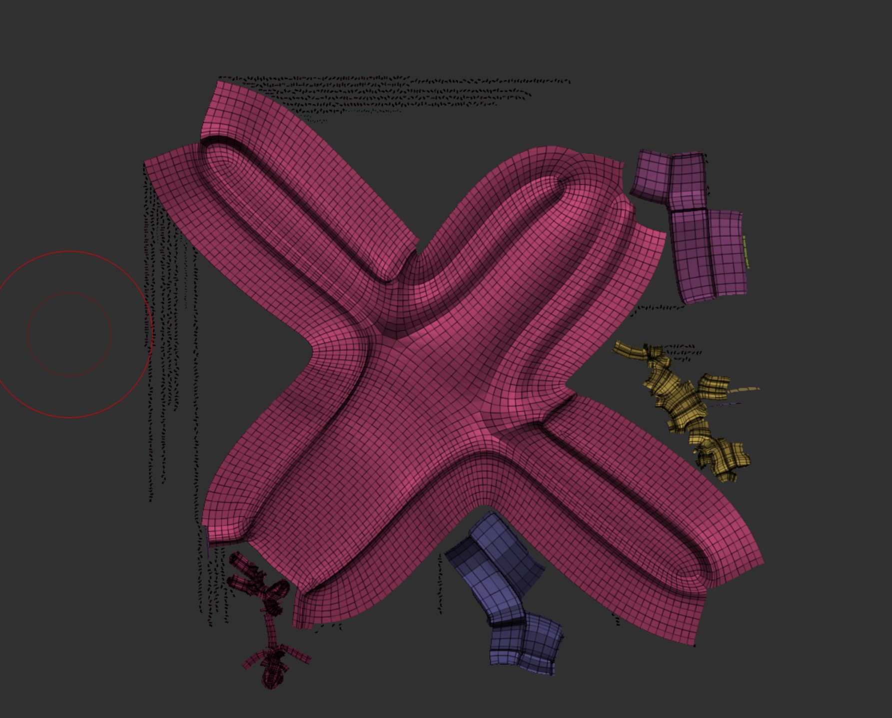 I then used UV master to create the UVs making sure to use the polygon setting and the symmetry setting if needed. To assist Zbrush with creating the seams I made sure to use the attract and project paint tool to try and make sure seams were out of the way as best as possible. Here is an example of the UVs, protect and attract and the seams being at the back of the trousers, and as you will see in a example later on the seams are not visible unless the texture pattern changes.