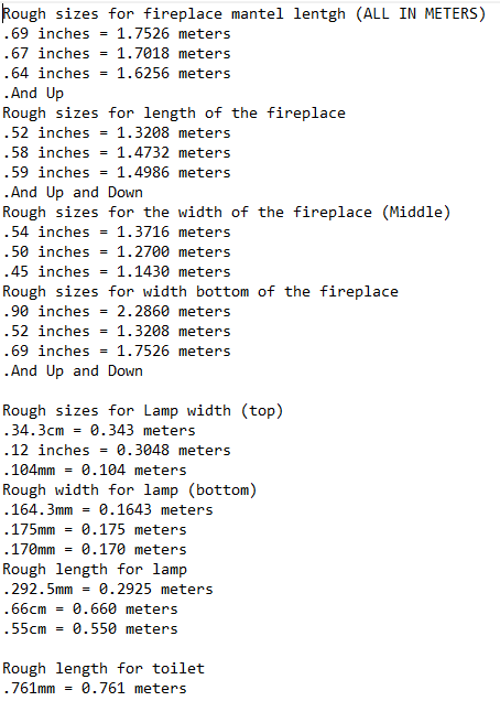 The research continued as we are wanting to get real world model sizes (in meters) so for the fireplace i am designing i have found sizes for the mantel piece, the length, and the width as well. I noted down about 3 sizes per criteria.