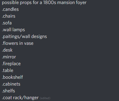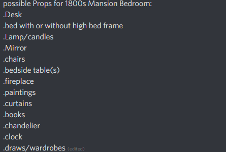 Following on from last week we created a google drive/google dox that we can all add to etc. we then started to plan the rooms and how we would have them look as well. This includes the size and all of the props inside. To find the props that we might use we did some research looking at photos etc to see what props are included in the rooms. Once we had done we then created bullet point lists of the items and sent them into out discord to discuss.
