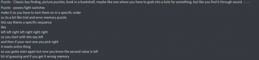 Following on from the previous point, planning the project was done pretty quickly, we originally started thinking of some concepts for what we could do based on games we all had played and enjoyed these covered genres such as horror, action, RPG, etc. We then came up with the idea of a haunted mansion and the user had to complete different puzzles to progress. Different ideas kept getting shared which was great because it meant we had a lot of choice/freedom, here is an screenshot of some examples we came up with.
