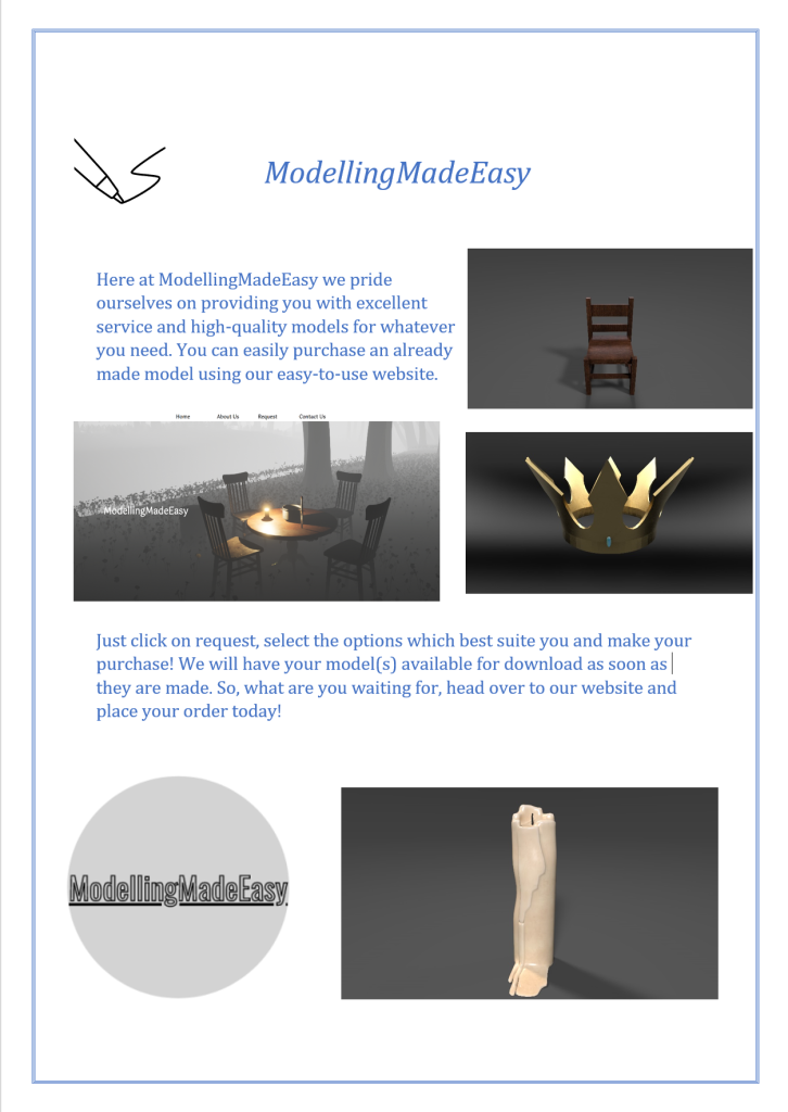 Here is a visual have made for my Business, i made sure to use a bright colour so it stands out to the potential customer(s) but didn’t want to add too much so it started to look too bright etc. I made sure to add my business logo into it and a few examples of my previous work as well, just so i didn’t use too much text. This isn’t too advanced as i used word but it can be built upon and added to in other software if and when needed.